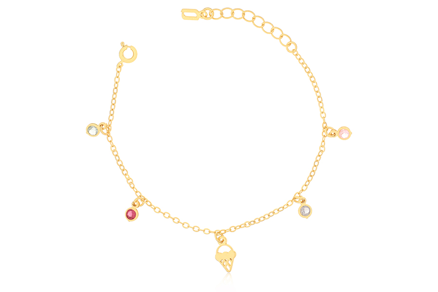 PULSEIRA INFANTIL BANHADA EM OURO, ELO 1,10mm COM BOLINHA, 14cm COMPRIMENTO, PONTO DE LUZ 3,50mm, AMOR DA DINDA 10mm COM CORAÇÃO