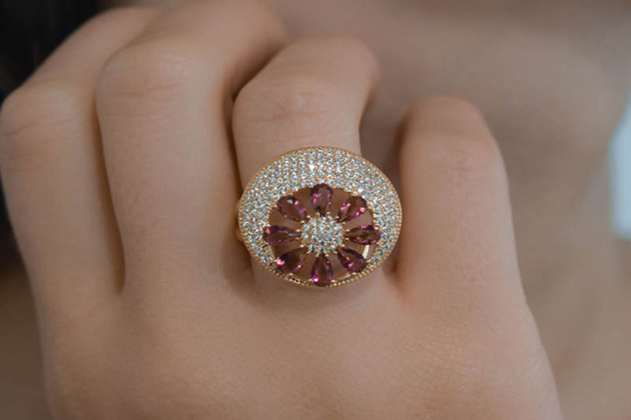 ANEL BANHADO EM OURO, REDONDO ACHATADO 26mm, COM ZIRCÔNIAS