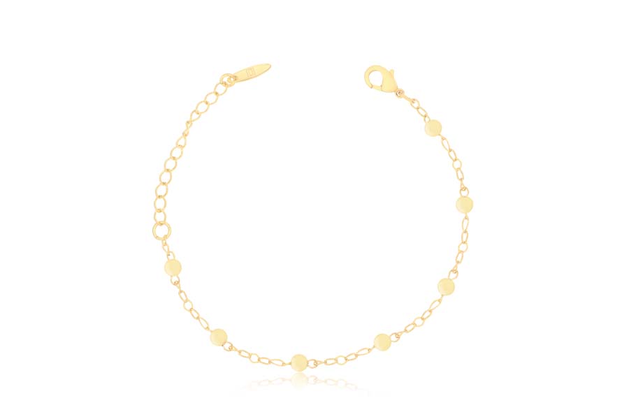 PULSEIRA INFANTIL BANHADA EM OURO, ELO 1,10mm COM BOLINHA, 14cm COMPRIMENTO, PONTO DE LUZ 3,50mm, AMOR DA TITIA 10mm COM CORAÇÃO