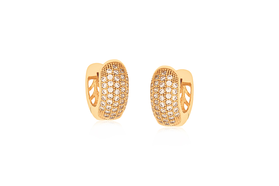 BRINCO BANHADO EM OURO, OVAL CRAVEJADO 21mm LARGURA E 30mm ALTURA, LATERAIS CRAVEJADAS