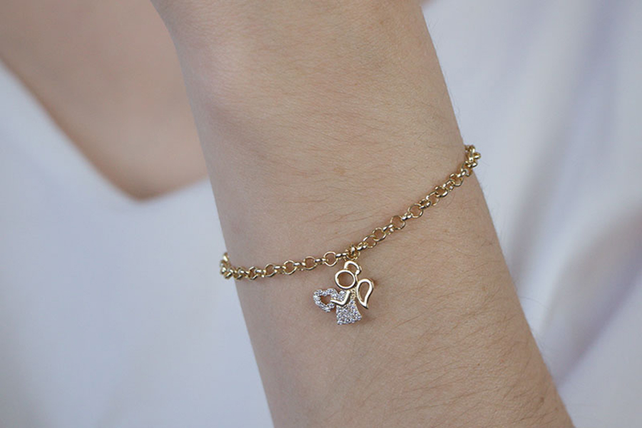 PULSEIRA BANHADA EM OURO, ELO PORTUGUÊS 3mm, ELO CORAÇÃO 4,20mm LARGURA, PINGENTE CORAÇÃO 11mm LARGURA COM MENINO