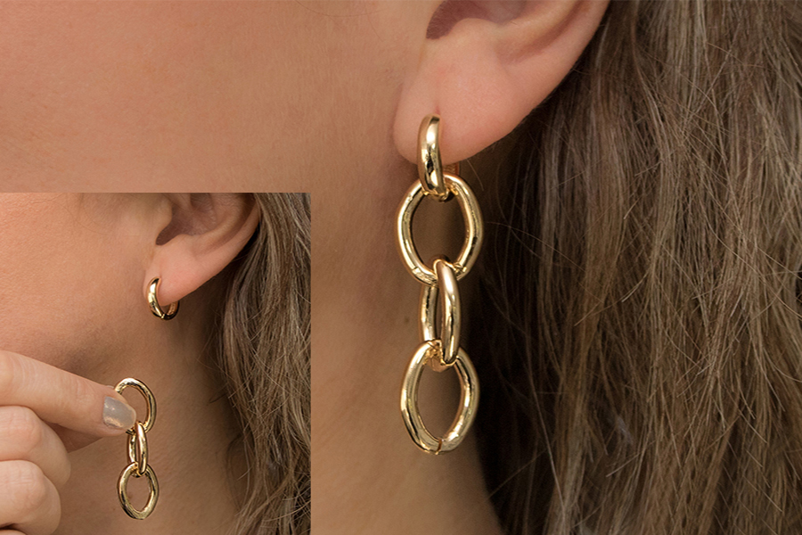 BRINCO BANHADO EM OURO, ARGOLINHA 13,50mm DIÂMETRO, CORRENTE ELO CORAÇÃO 2,50mm TRIPLA, PIERCING 17mm
