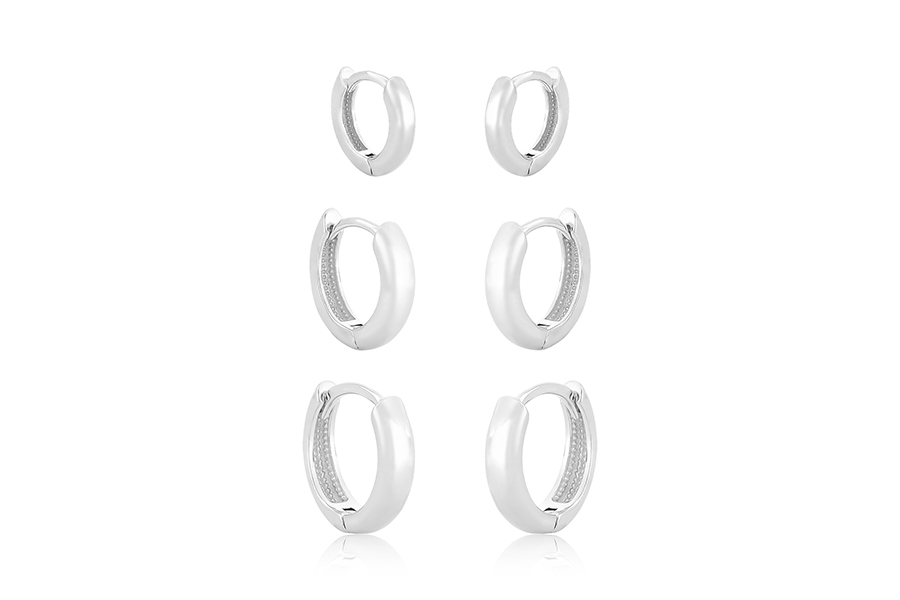 CONJUNTO BANHADO EM PRATA LEVE, TRIO DE ARGOLINHAS, 15mm E 24 ZIRCÔNIAS, 13mm E 20 ZIRCÔNIAS, 11mm E 18 ZIRCÔNIAS