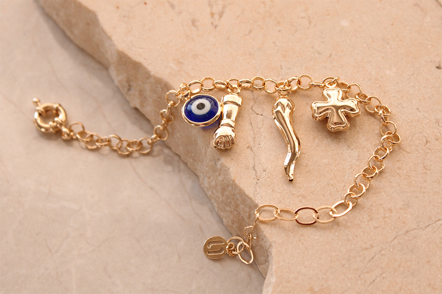 PULSEIRA BANHADA EM OURO, ELO PORTUGUÊS 2,50mm, 16cm COMPRIMENTO, PONTO DE LUZ 4,50mm E PINGENTE FÉ 11mm DIÂMETRO