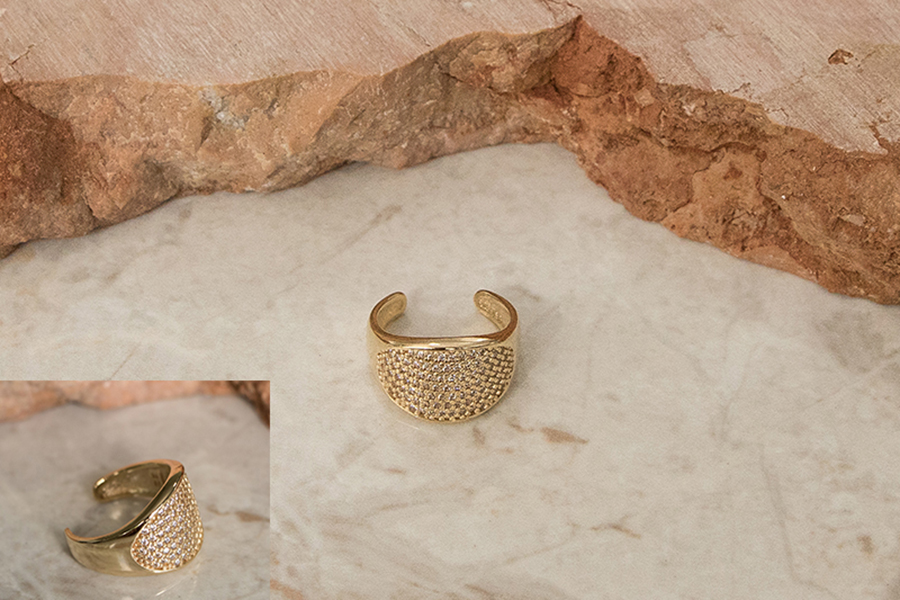 ANEL BANHADO EM OURO, 11mm LARGURA, COM ZIRCÔNIAS GOTA E QUADRADA 5mm LARGURA
