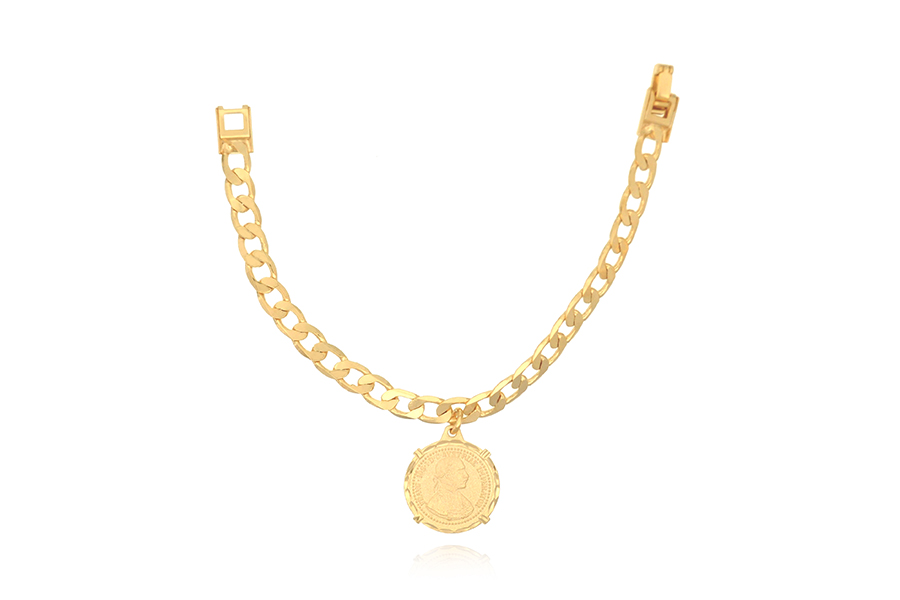 PULSEIRA BANHADA EM OURO, ESCRAVA, ELO 3,10mm LARGURA, 18cm COMPRIMENTO E PINGENTE REDONDO 17mm DIÂMETRO