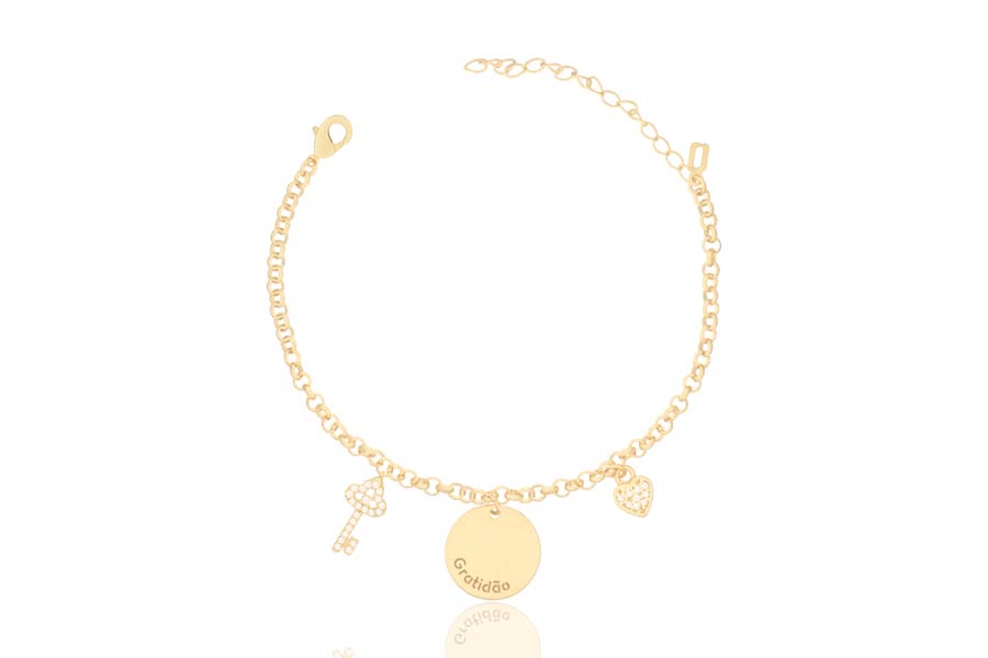 PULSEIRA BANHADA EM OURO, ELO 1,50mm DUPLO, 16cm COMPRIMENTO, ZIRCÔNIA CORAÇÃO E MEDALHA 15mm DIÂMETRO CORAÇÃO