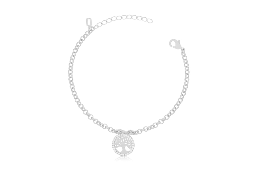 PULSEIRA BANHADA EM RÓDIO BRANCO, INFANTIL, ELO PORTUGUÊS 2,50mm, 14cm COMPRIMENTO, EXTENSOR 3cm COMPRIMENTO E ÁRVORE DA VIDA 17mm DIÂMETRO