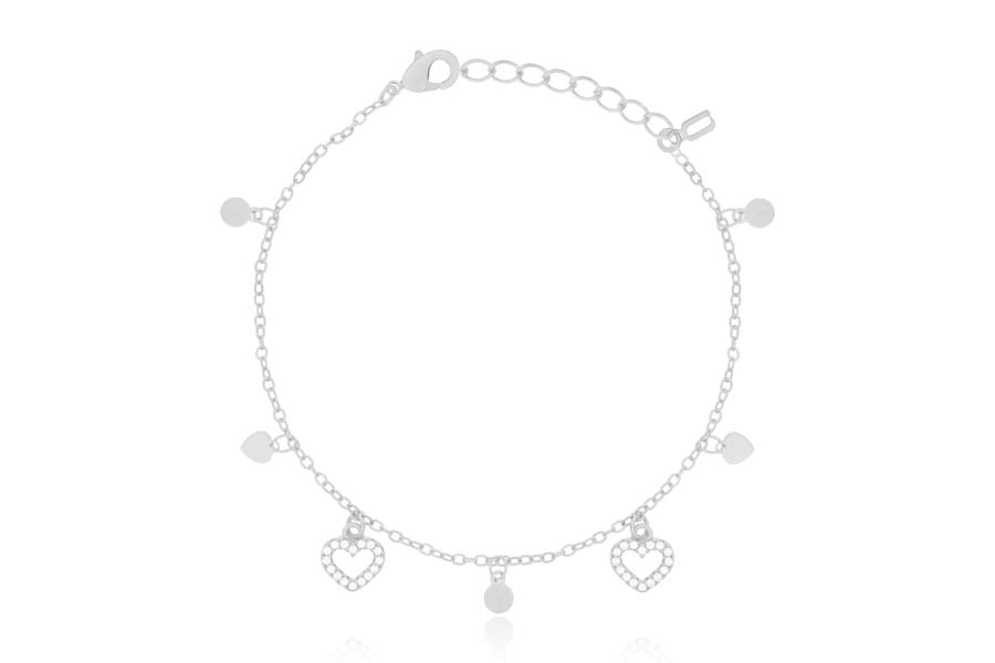 PULSEIRA BANHADA EM PRATA LEVE, DUPLA, ELO 1,50mm ESPESSURA, PONTO DE LUZ 5mm E CORAÇÃO VAZADO 15,50mm LARGURA COM PATA