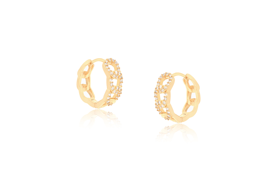 BRINCO BANHADO EM OURO, REDONDO VAZADO 29mm, COM ZIRCÔNIAS