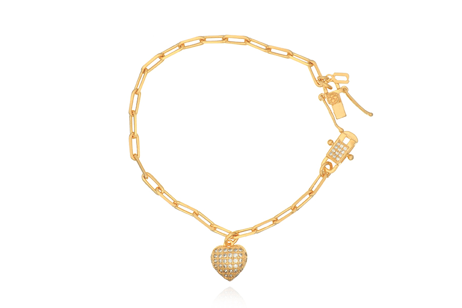 PULSEIRA BANHADA EM OURO, ELO 1,50mm DUPLO, 16cm COMPRIMENTO, ZIRCÔNIA CORAÇÃO E MEDALHA 15mm DIÂMETRO CORAÇÃO