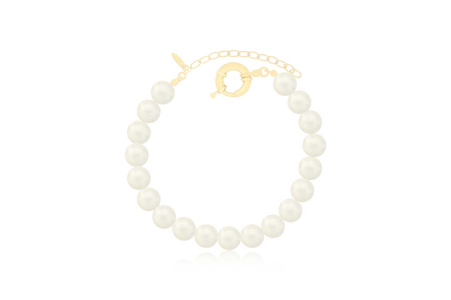 PULSEIRA BANHADA EM OURO, INFANTIL, CÍRCULO 7,50mm DIÂMETRO COM PÉROLA E BORDA CRAVEJADA, ELO VENEZIANA, FECHO SHAMBALA
