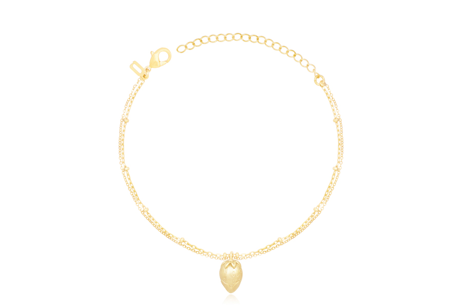 PULSEIRA INFANTIL BANHADA EM OURO, ELO 1,10mm COM BOLINHA, 14cm COMPRIMENTO, PONTO DE LUZ 3,50mm, AMOR DA DINDA 10mm COM CORAÇÃO