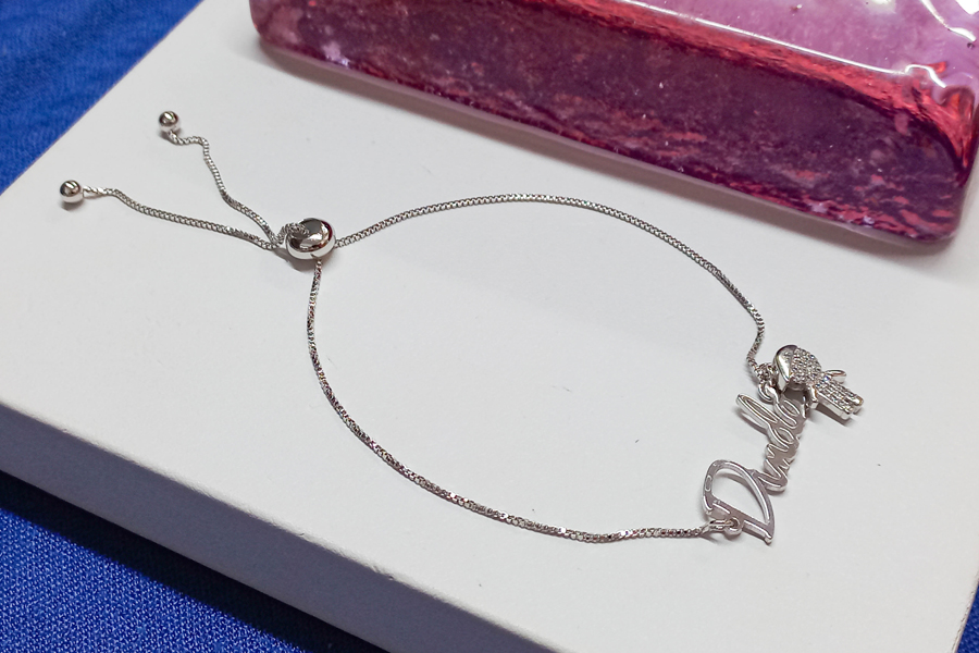 PULSEIRA BANHADA EM RÓDIO BRANCO, ELO PORTUGUÊS 2,50mm, 16cm COMPRIMENTO, EXTENSOR 5cm COMPRIMENTO, PONTO DE LUZ, GRATIDÃO E AMOR 12mm DIÂMETRO