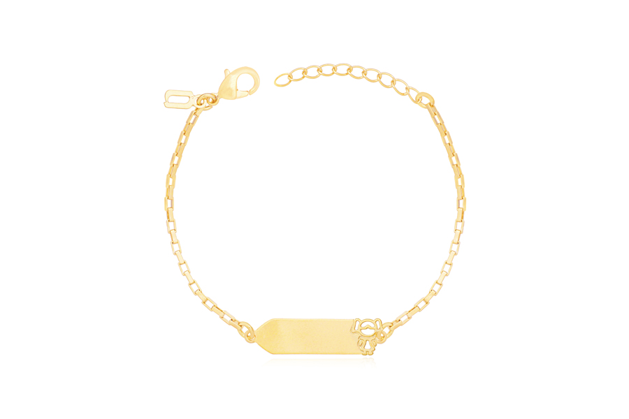 PULSEIRA BANHADA EM OURO, INFANTIL, MELINDROSA, ELO VENEZIANA LONGA 1,50mm ESPESSURA, CHAPINHA COM MENINA 24mm COMPRIMENTO E EXTENSOR 3,50cm COMPRIMENTO