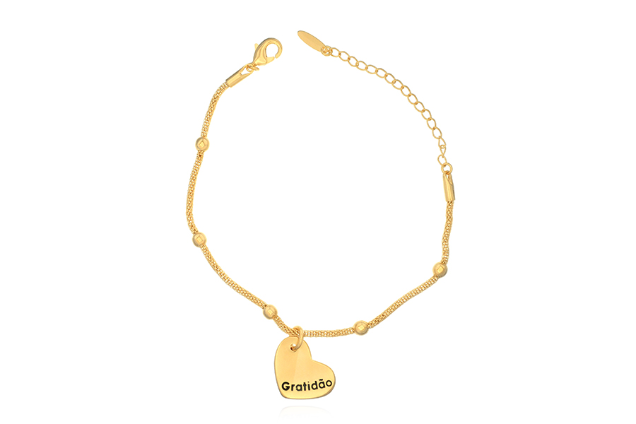 PULSEIRA BANHADA EM OURO, ELO 1,20mm COM BOLINHA OVAL, 17cm COMPRIMENTO, PONTO DE LUZ 4,50mm, TE AMO TITIA 14mm DIÂMETRO COM CORAÇÃO