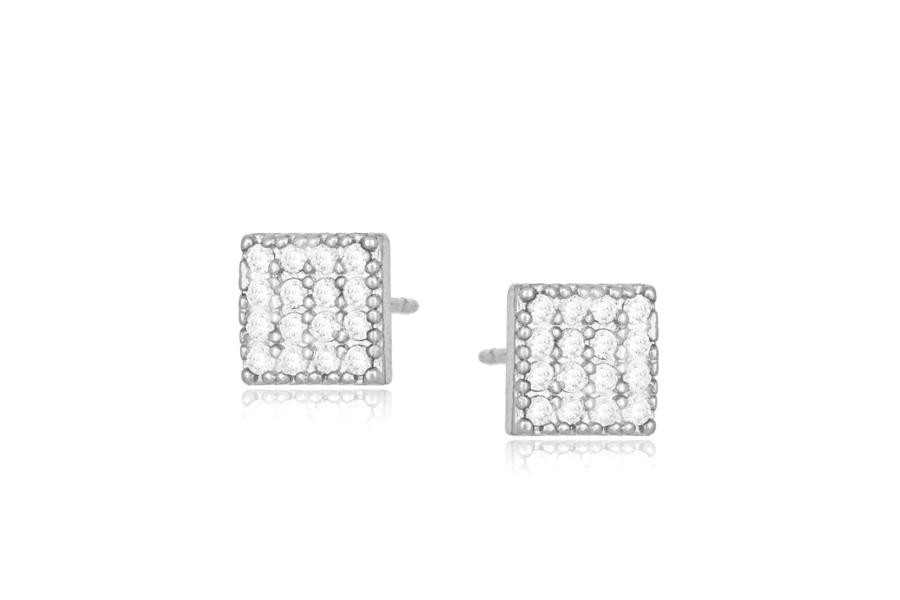 BRINCO EM PRATA, QUADRADO 9,10mm LARGURA CRAVEJADO, BORDAS ACHATADAS