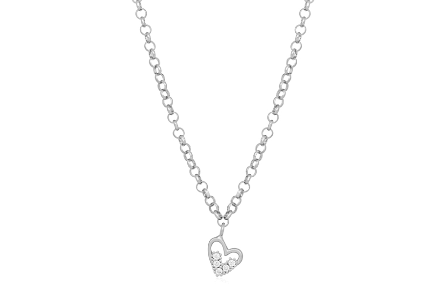 GARGANTILHA BANHADA EM RÓDIO BRANCO, ELO OVAL 9,50mmX6,50mm, 80cm COMPRIMENTO E FECHO CORAÇÃO COM ZIRCÔNIA