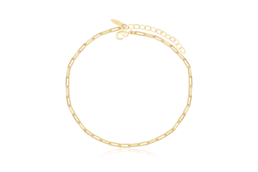 TORNOZELEIRA BANHADA EM OURO, CORRENTE ELO GRUMET ALONGADO 5,50mm LARGURA, 23cm COMPRIMENTO, EXTENSOR 5cm COMPRIMENTO E PESO 7,20g
