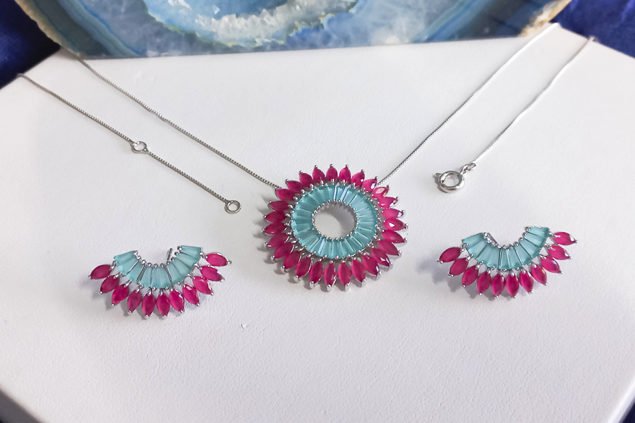 CONJUNTO BANHADO EM PRATA LEVE, COM PREÇO PROMOCIONAL, PEDRAS