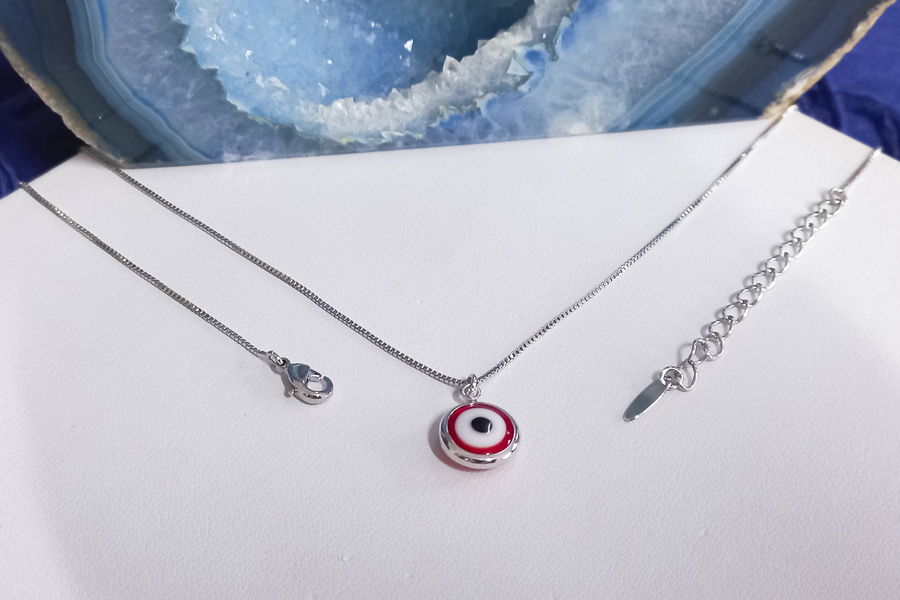 CHOKER BANHADA EM RÓDIO BRANCO, ELO PORTUGUÊS 2,50mm, 36cm COMPRIMENTO, OLHO GREGO 4mm, PONTO DE LUZ 4,50mm E OLHO HÓRUS