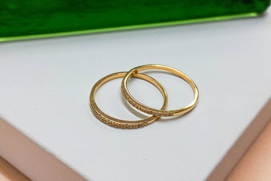 ANEL BANHADO EM OURO, ALIANÇA COM ZIRCÔNIAS BRANCAS E NEGRAS