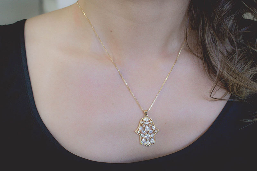 GARGANTILHA BANHADA EM OURO, PATUÁ COM ZIRCÔNIA, OLHO GREGO, BÚZIOS E MÃO DE FÁTIMA, ELO CARTIER 4,20X1,90mm, 80cm COMPRIMENTO