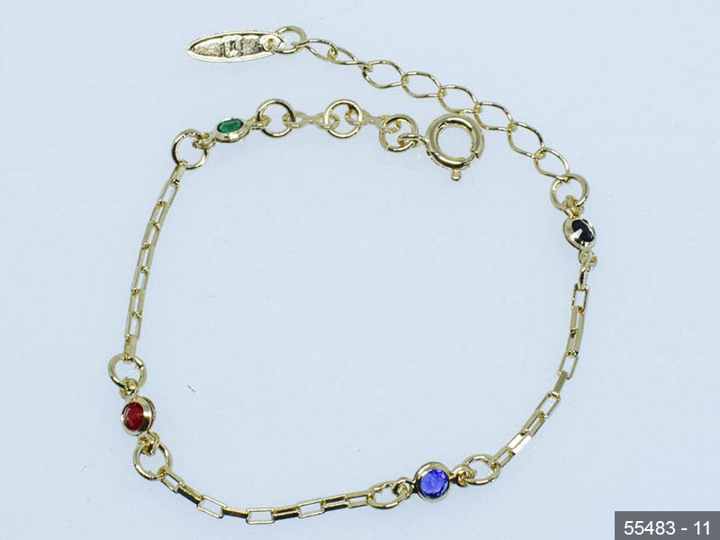 PULSEIRA BANHADA EM OURO, ELO PORTUGUÊS 5mm, 18cm COMPRIMENTO E CORAÇÃO 12mm LARGURA COM ZIRCÔNIAS COLORIDAS