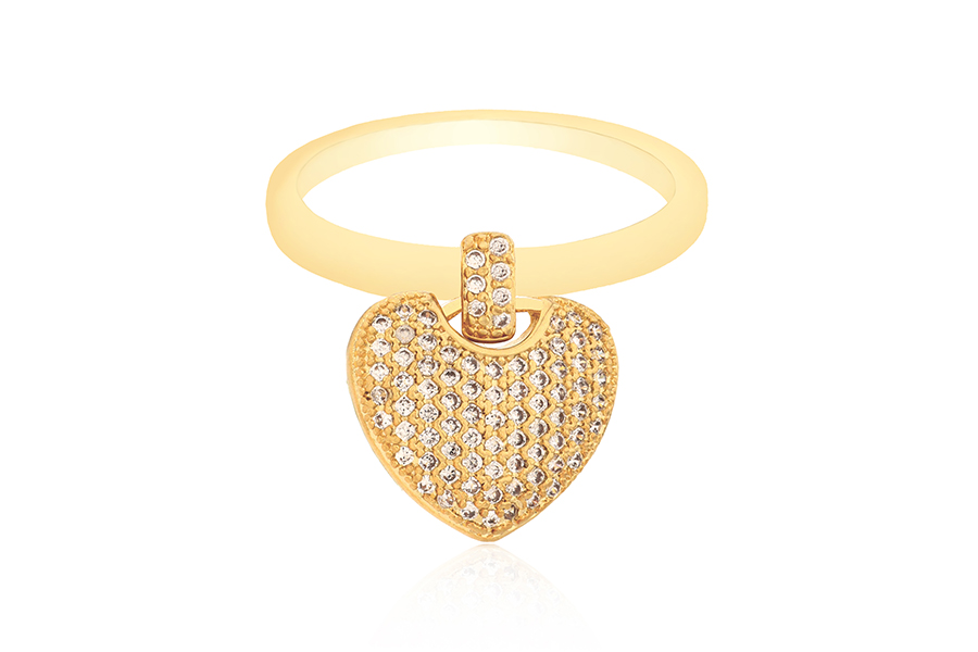 ANEL BANHADO EM OURO, CORAÇÃO COM 53 ZIRCÔNIAS, 14mm LARGURA E 12mm ALTURA