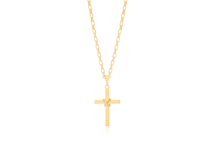GARGANTILHA BANHADA EM OURO, ELO 2,30mm LARGURA, 60cm COMPRIMENTO E CRUZ 25mm ALTURA, 16mm LARGURA