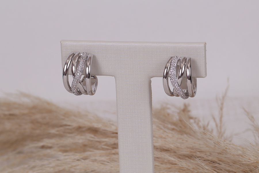 BRINCO BANHADO EM RÓDIO BRANCO, ARGOLINHA 14mm DIÂMETRO, 10mm LARGURA COM 5 ZIRCÔNIAS