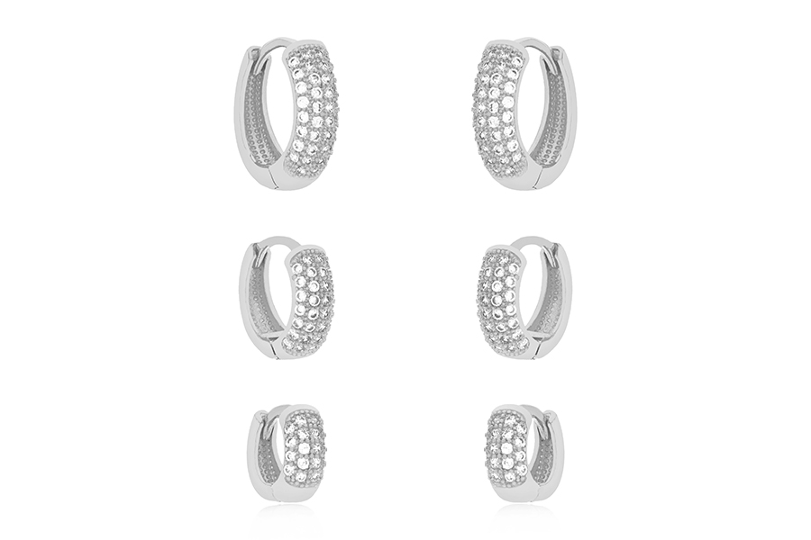 BRINCO BANHADO EM RÓDIO BRANCO, ARGOLINHA 14mm DIÂMETRO, 10mm LARGURA COM 5 ZIRCÔNIAS