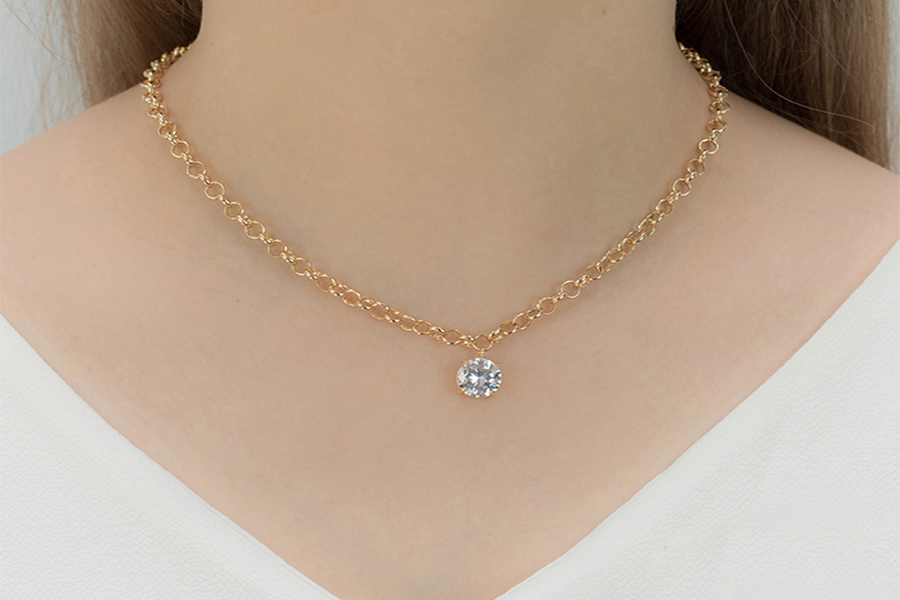GARGANTILHA BANHADA EM OURO, CRISTAL REDONDO 14mm DIÂMETRO E CRISTAL GOTA 28X10mm, RABO DE RATO 0,90mm ESPESSURA, AJUSTÁVEL
