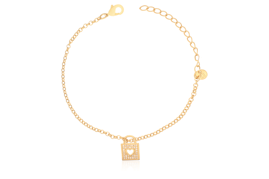 PULSEIRA BANHADA EM OURO, ELO PORTUGUÊS 2,50mm DIÂMETRO, 16cm COMPRIMENTO E CORAÇÃO 10mm LARGURA I LOVE MUSIC (EU AMO MÚSICA)