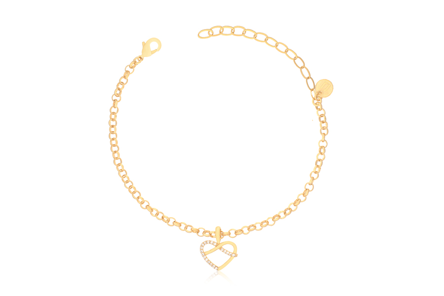 PULSEIRA BANHADA EM OURO, ELO 2,30mm LARGURA, 16cm COMPRIMENTO, EXTENSOR 5cm COMPRIMENTO E CORAÇÃO 7mm LARGURA, PARA QUALQUER COR