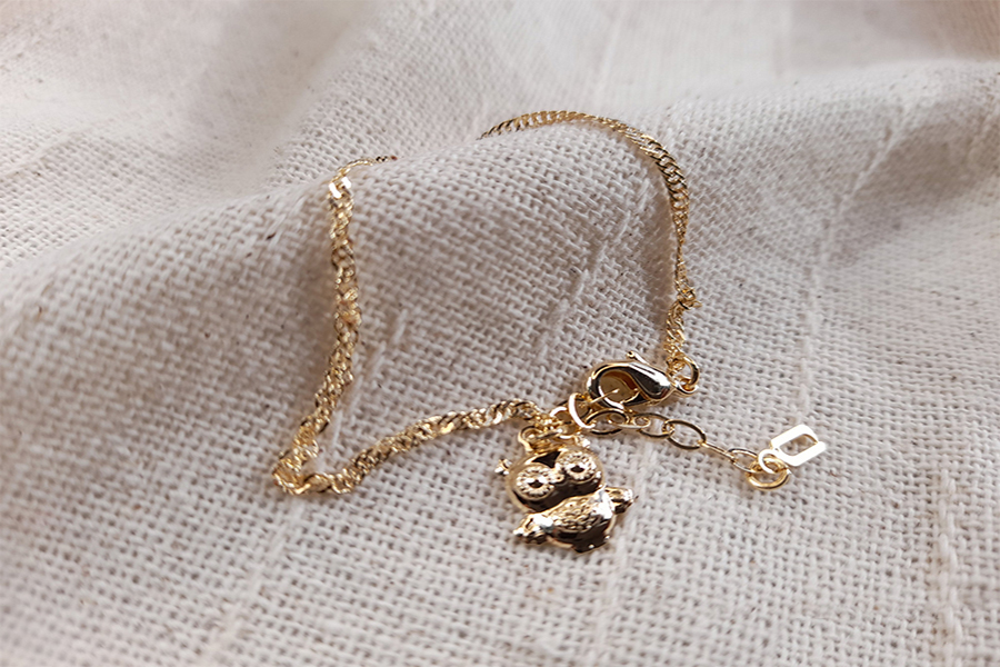 PULSEIRA INFANTIL BANHADA EM OURO, ELO 1,10mm COM BOLINHA, 14cm COMPRIMENTO, PONTO DE LUZ 3,50mm, AMOR DA DINDA 10mm COM CORAÇÃO