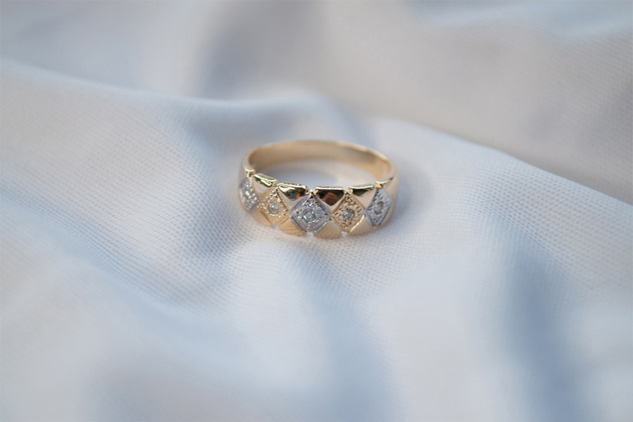 ANEL BANHADO EM OURO, ALIANÇA COM ZIRCÔNIAS BRANCAS E NEGRAS