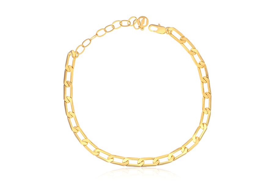 TORNOZELEIRA BANHADA EM OURO, CORRENTE ELO GRUMET ALONGADO 5,50mm LARGURA, 23cm COMPRIMENTO, EXTENSOR 5cm COMPRIMENTO E PESO 7,20g