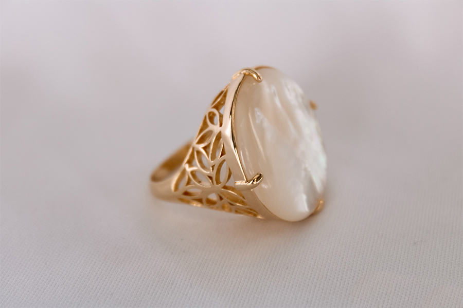 ANEL BANHADO EM OURO, GOTA MADREPÉROLA 28x19mm