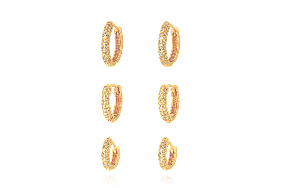 BRINCO BANHADO EM OURO, ARGOLA COM BAGUETES E ZIRCÔNIAS CRAVEJADAS