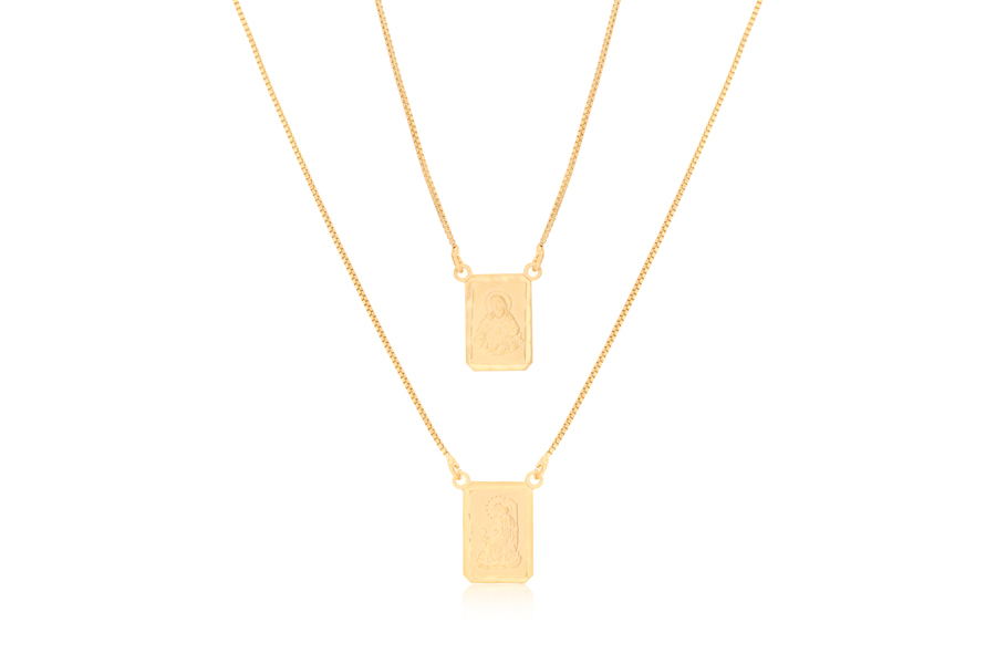 ESCAPULÁRIO EM PRATA, SAGRADO CORAÇÃO DE JESUS E NOSSA SENHORA DO CARMO, RETANGULAR 9,50mm LARGURA, ELO GRUMET, 60cm COMPRIMENTO