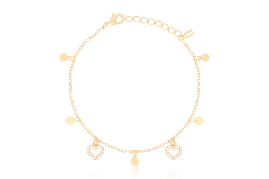 PULSEIRA BANHADA EM OURO, ELO 4mm LARGURA, 20cm COM EXTENSOR, DOIS CORAÇÕES E CORAÇÃO GATO 11mm LARGURA