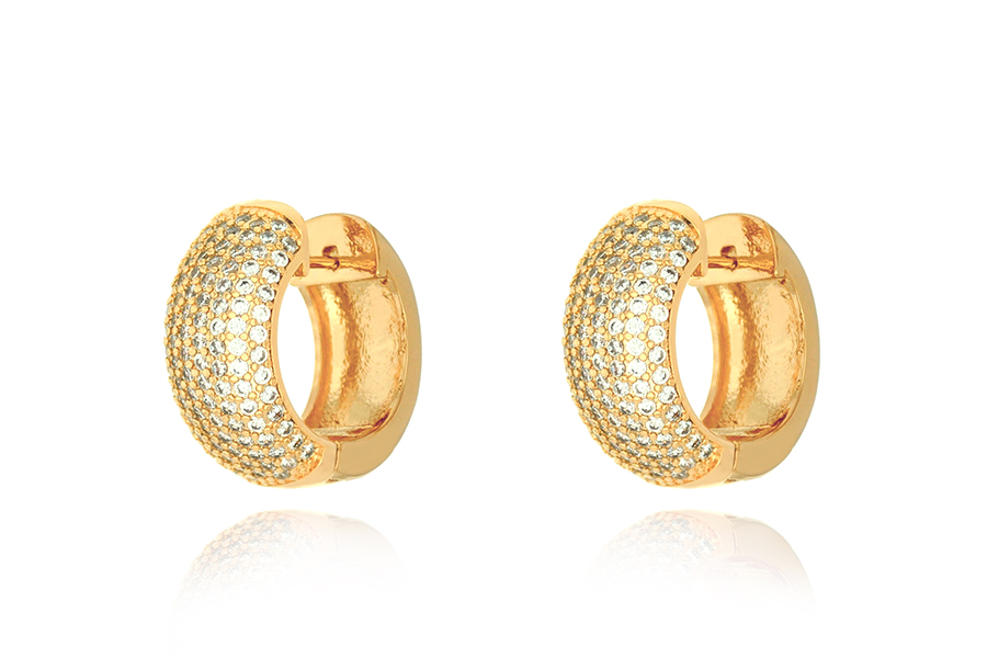 BRINCO BANHADO EM OURO, REDONDO 15mm DIÂMETRO, ZIRCÔNIAS BAGUETE