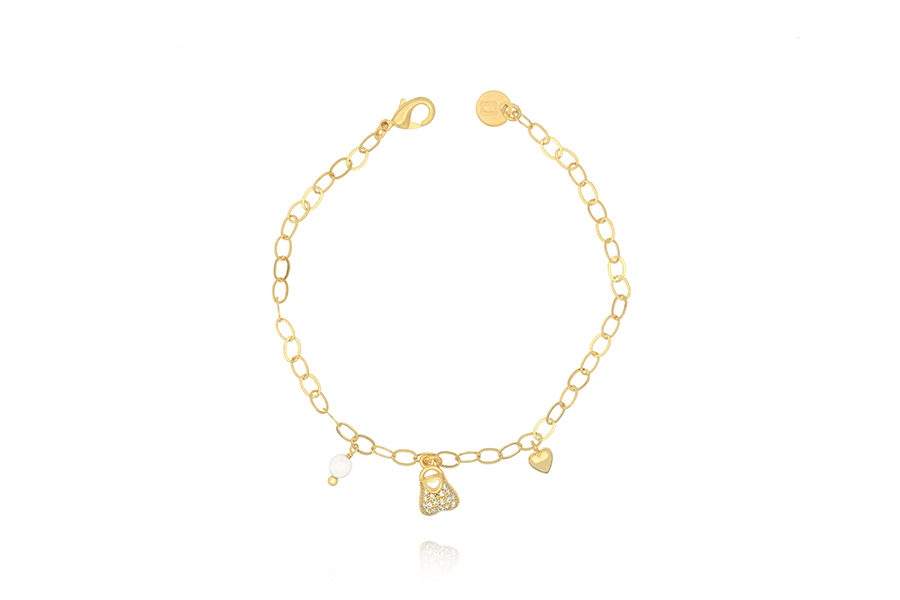 PULSEIRA BANHADA EM OURO, ELO PORTUGUÊS 3mm, ELO CORAÇÃO 4,20mm LARGURA, PINGENTE CORAÇÃO 11mm LARGURA COM MENINA