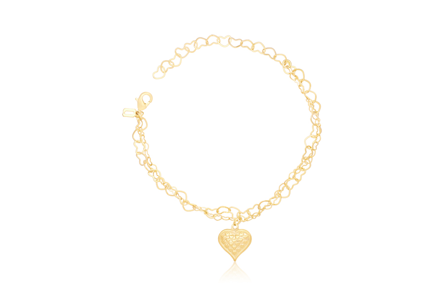 PULSEIRA BANHADA EM OURO, ELO PORTUGUÊS 3mm, ELO CORAÇÃO 4,20mm LARGURA, PINGENTE CORAÇÃO 11mm LARGURA COM MENINA