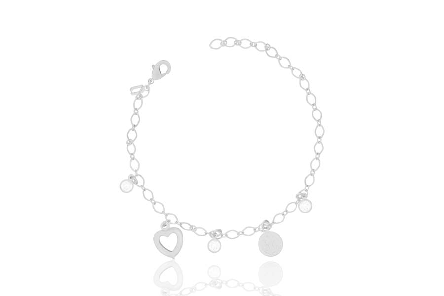 PULSEIRA BANHADA EM RÓDIO BRANCO, ELO 4mm LARGURA, 20cm COM EXTENSOR, DOIS CORAÇÕES E CORAÇÃO CACHORRO 11mm LARGURA