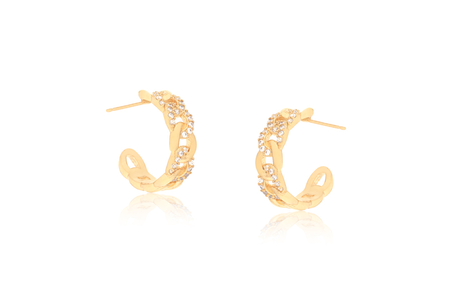 BRINCO BANHADO EM OURO, CURVADO, 2 FIOS TRANÇADOS, 1 COM DETALHE CRAVEJADO E 1 LISO