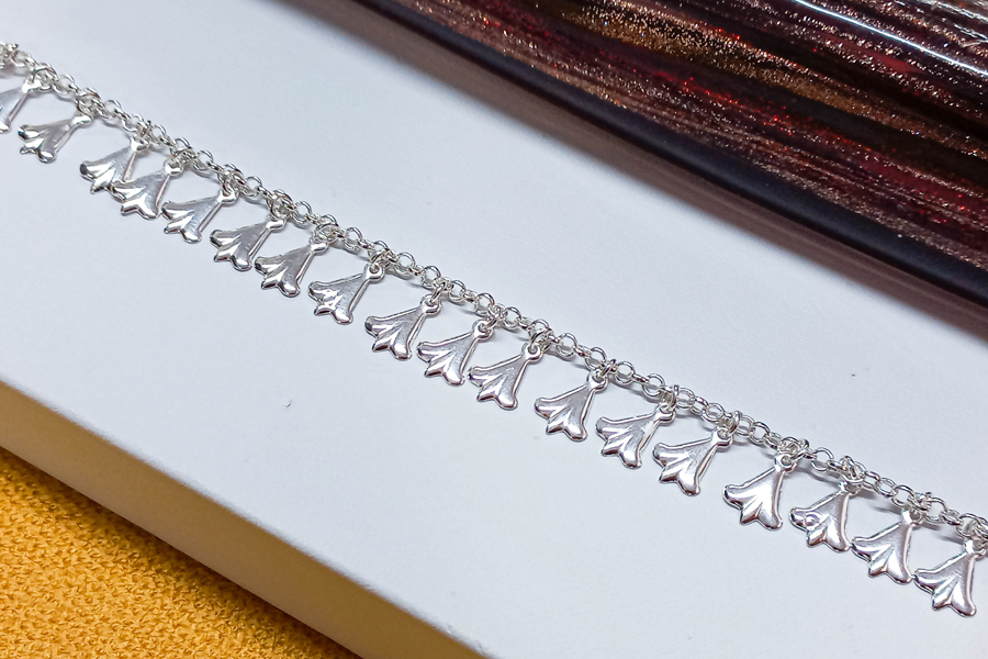 TORNOZELEIRA BANHADA EM PRATA LEVE, PINGENTES 7mm LARGURA, ELO PORTUGUÊS 2,60mm, 22cm COMPRIMENTO, EXTENSOR 5cm