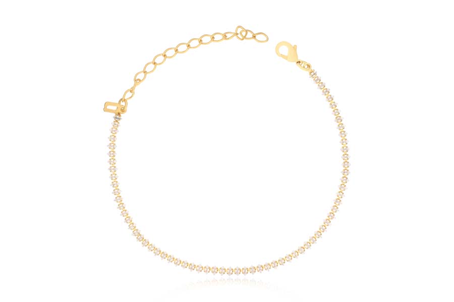 PULSEIRA BANHADA EM OURO, INFANTIL, CÍRCULO 7,50mm DIÂMETRO COM PÉROLA E BORDA CRAVEJADA, ELO VENEZIANA, FECHO SHAMBALA