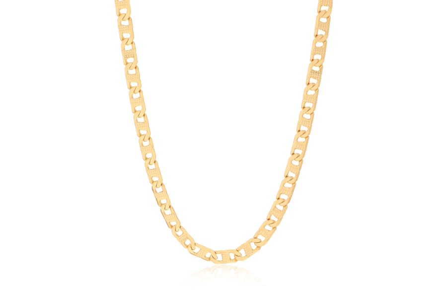 GARGANTILHA BANHADA EM OURO, ELO 7,50mm LARGURA, 43cm COMPRIMENTO, EXTENSOR 10cm COMPRIMENTO E CORAÇÃO 35mm LARGURA, LISO OU ACETINADO